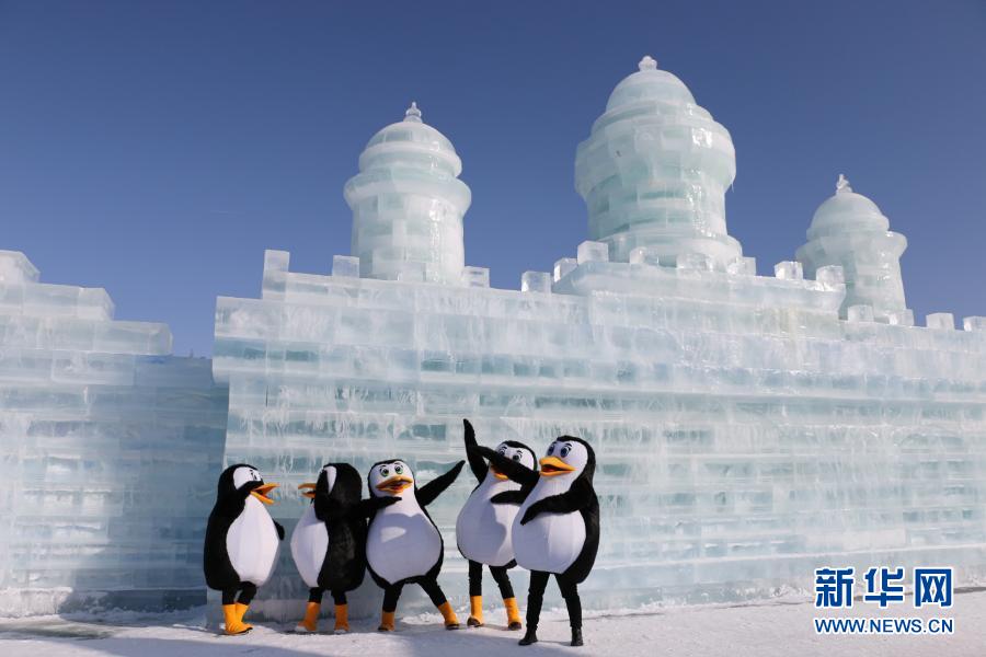 2021年1月1日,“冰雪企鹅”在河北省承德市丰宁满族自治县大滩镇一处冰雕前巡游。