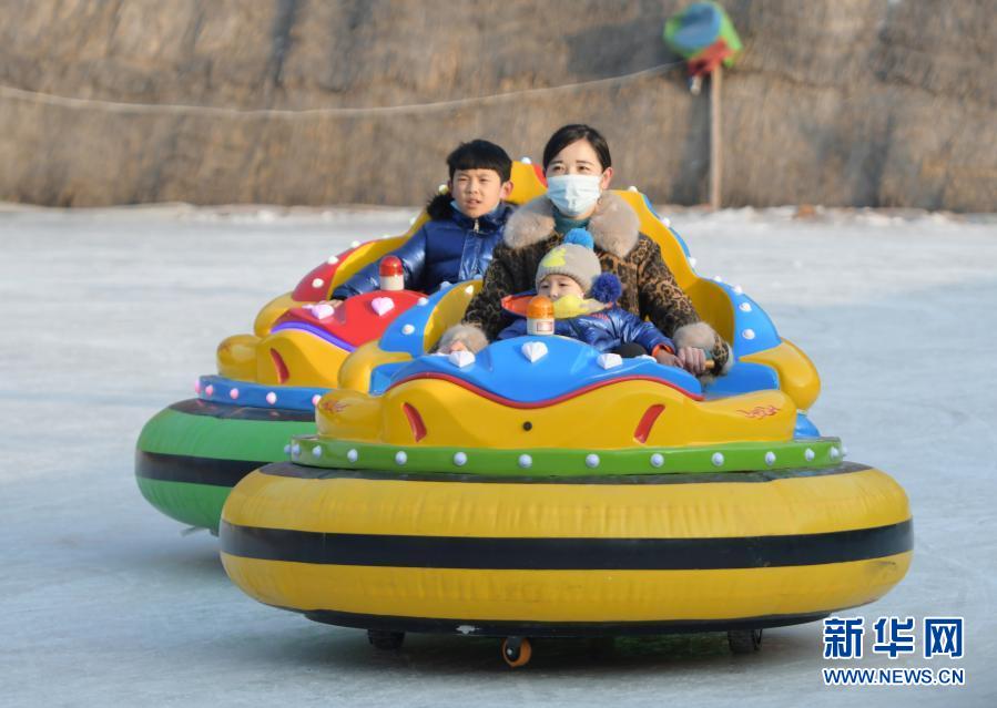 2021年1月1日,在甘肃省临夏回族自治州临夏市南龙镇金色草滩景区,游人乘坐雪地碰碰车。