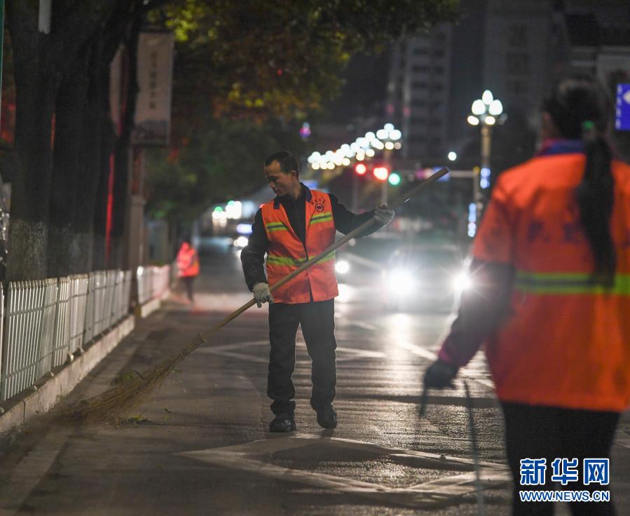 2021年1月1日清晨,在贵州省黔东南苗族侗族自治州凯里市,环卫工人在清扫街道。新华社发(蔡兴文 摄)