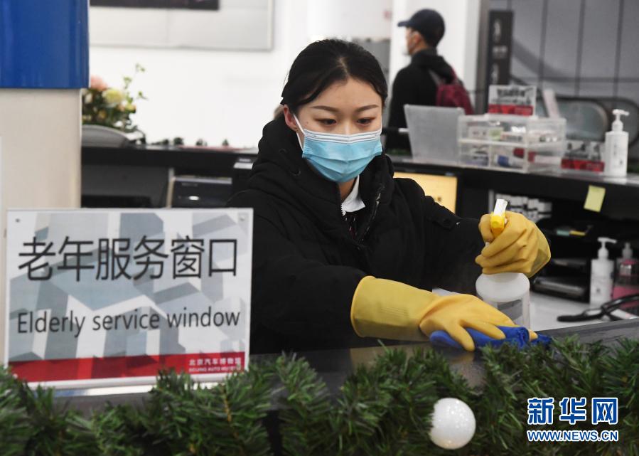 2021年1月1日,在位于北京市丰台区的北京汽车博物馆,工作人员为服务台进行消毒。新华社记者 任超 摄