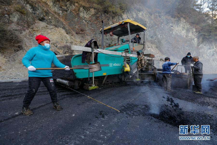 2021年1月1日,在四川雅安牛背山,筑路工人冒着寒冷在通往山顶的道路上铺沥青。新华社记者 沈伯韩 摄