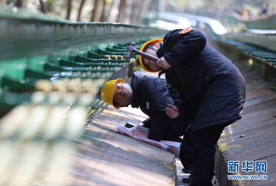 2021年1月1日,湖南张家界市武陵源区十里画廊观光电车工作人员廖少波(左)、王坤习安在检查电车钢轨。新华社发(吴勇兵 摄)