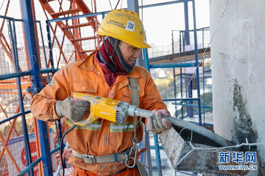 2021年1月1日,工人张高辉在浙江省景宁畲族自治县景文高速公路景宁高架桥主桥墩上施工。新华社发(李肃人 摄)