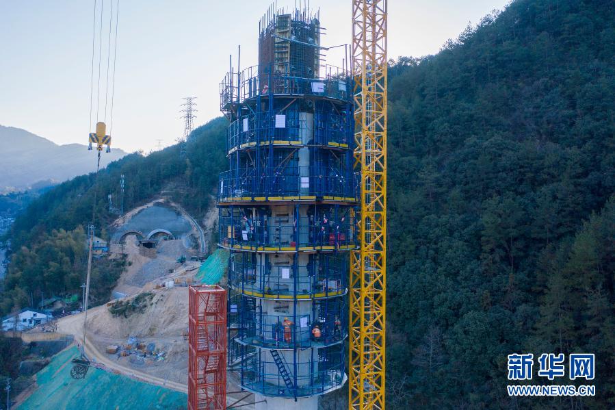 2021年1月1日,在浙江省景宁畲族自治县景文高速公路景宁高架桥,工人在离地60多米的桥墩上施工。新华社发(李肃人 摄)