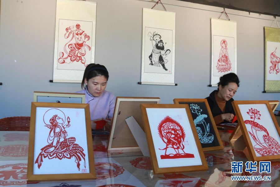在甘肃敦煌小镇鸣沙书院,学员在“敦煌剪纸”酒泉市级非物质文化遗产代表性传承人庄生娟的工作室内剪纸(2020年12月31日摄)。