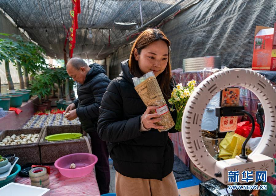 2021年1月1日,福建省漳州市高新区九湖镇百花村一家水仙花批发店的店主通过直播销售水仙花。新华社发(张旭 摄)