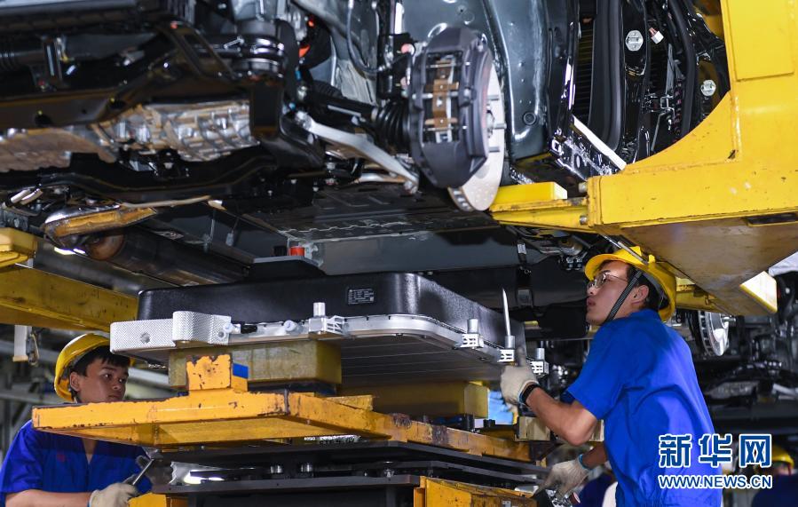工人在深圳比亚迪总部为新能源汽车安装电池(2020年9月23日摄)。新华社记者 毛思倩 摄