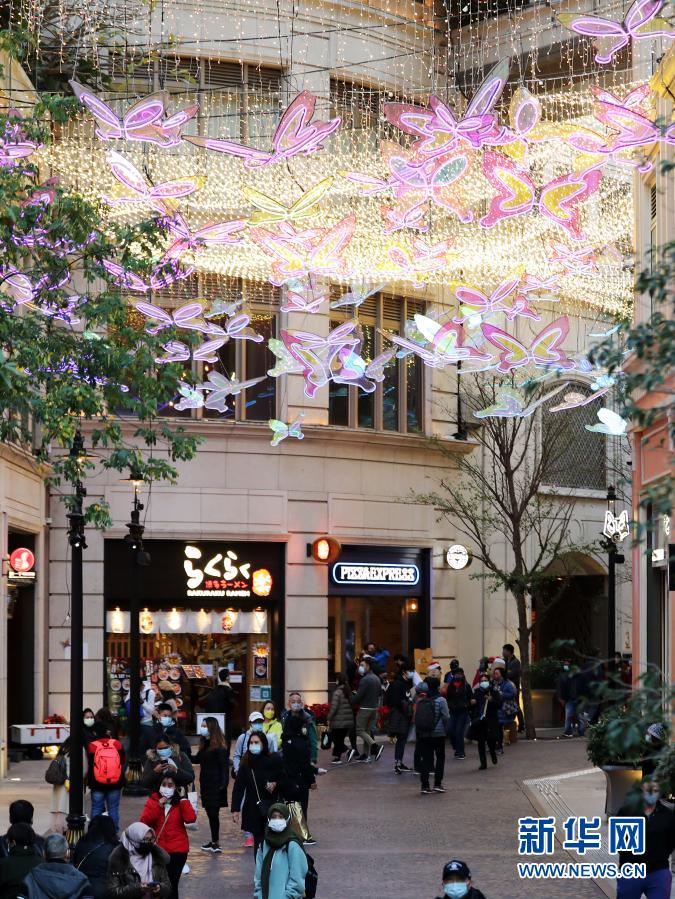 2021年1月1日,在香港利东街,香港市民戴口罩出行。