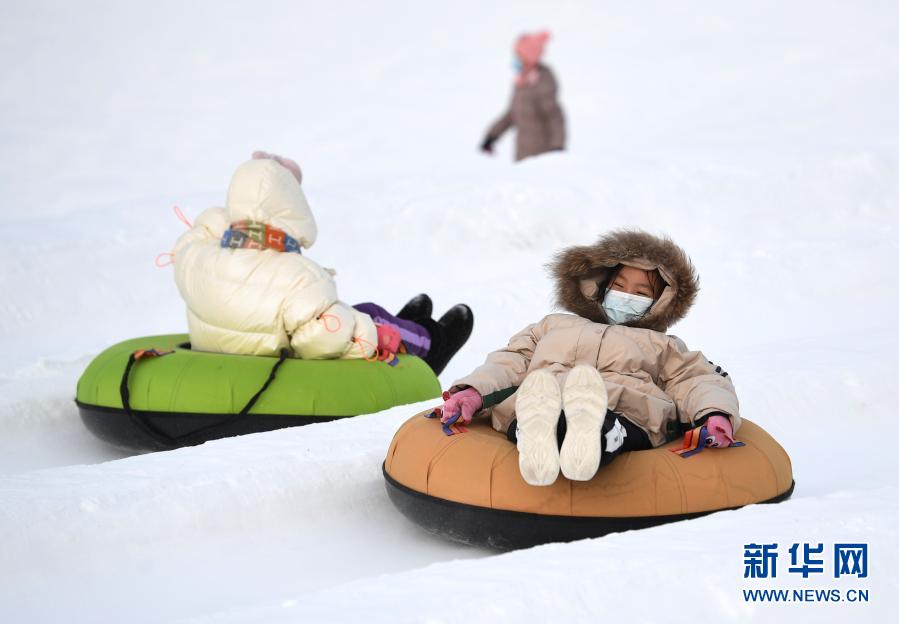 2021年1月1日,小朋友在新疆阿勒泰市桦林公园“桦林冬奥冰雪乐园”雪上项目区玩雪圈。新华社记者 沙达提 摄
