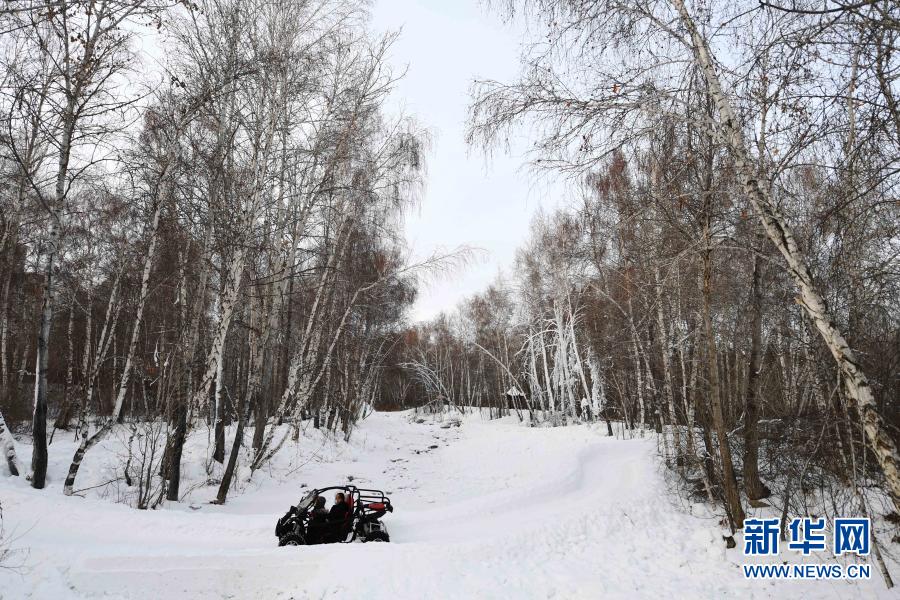 2021年1月1日,人们在新疆阿勒泰市桦林公园“桦林冬奥冰雪乐园”雪上项目区玩雪地卡丁车。新华社记者 沙达提 摄