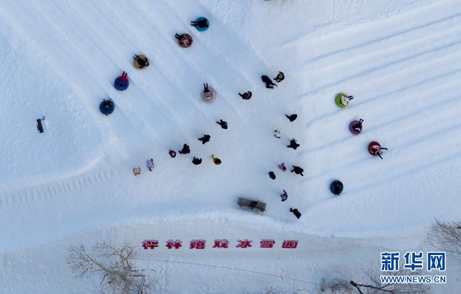 2021年1月1日,人们在新疆阿勒泰市桦林公园“桦林冬奥冰雪乐园”雪上项目区玩雪圈(无人机照片)。新华社记者 沙达提 摄