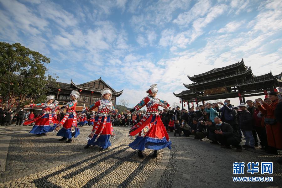2021年1月1日,苗族同胞在贵州省丹寨县万达小镇景区为游客表演苗族舞蹈。新华社发(黄晓海 摄)
