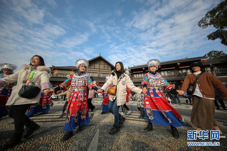 2021年1月1日,游客在贵州省丹寨县万达小镇景区与苗族同胞共跳芦笙舞。新华社发(黄晓海 摄)