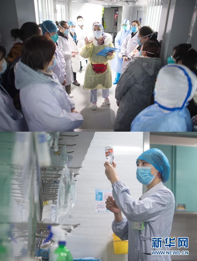 拼版照片:上图为2020年2月8日,护士长孙纯(中)在武汉雷神山医院走廊给护士分配任务,准备迎接转运患者;下图为2021年1月1日,护士长孙纯在武汉第一医院ICU配药。