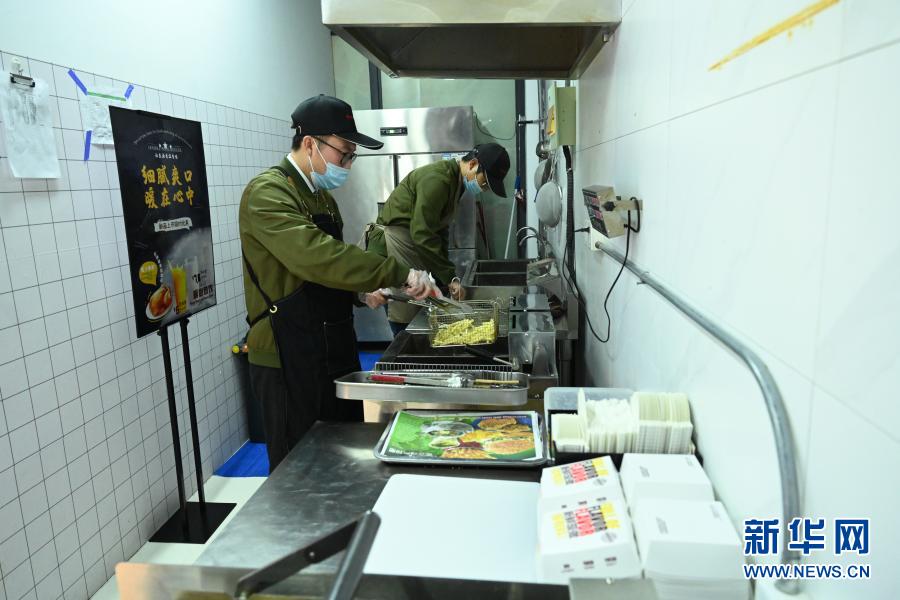 程启涛(左)在福建省南平市武夷新区的台湾青年实训基地为顾客炸薯条(2020年12月30日摄)。新华社记者 林善传 摄