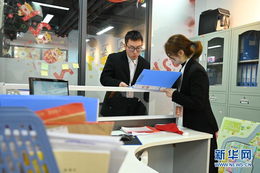 程启涛(左)在福建省南平市武夷新区的台湾青年实训基地与同事交流(2020年12月30日摄)。新华社记者 林善传 摄