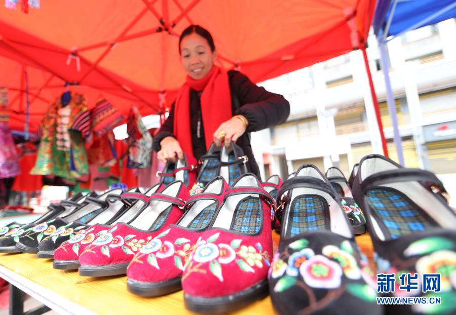 2021年1月1日,在榕江县农特产品暨民族工艺品展销会上,商家在整理商品。