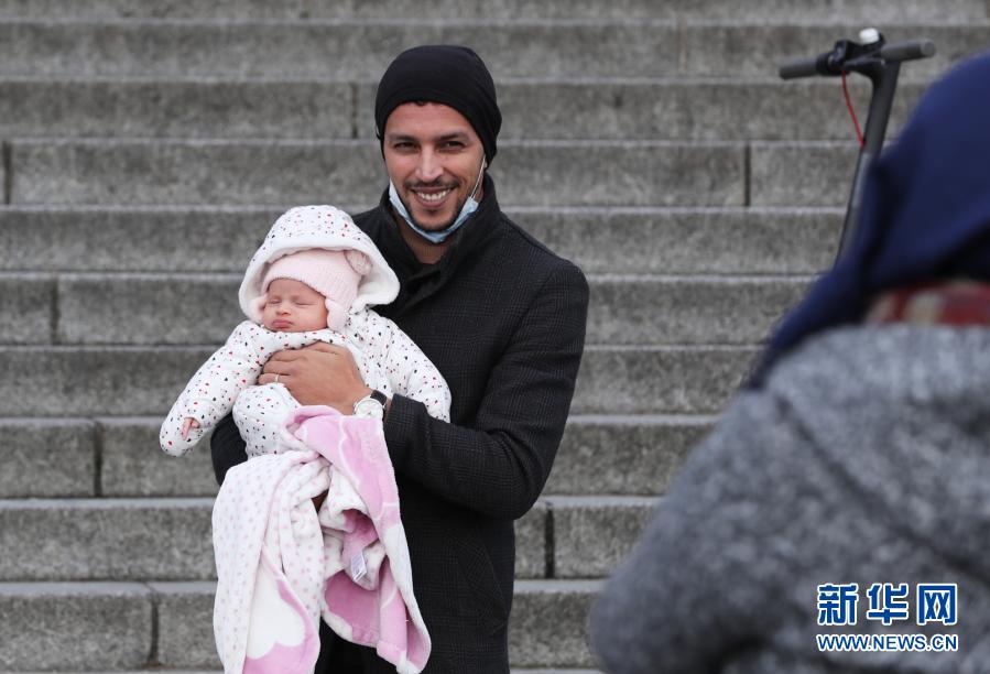 2021年1月1日,一位父亲抱着孩子在法国巴黎蒙马特高地自拍。