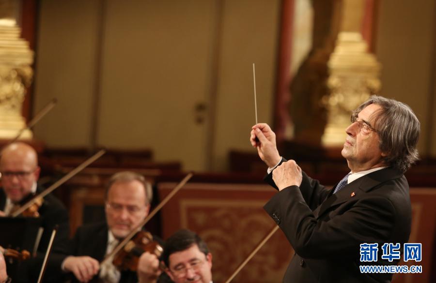 1月1日,维也纳爱乐乐团在里卡尔多·穆蒂(右一)的指挥下在奥地利维也纳金色大厅上演新年音乐会。新华社发(迪特.纳格摄)