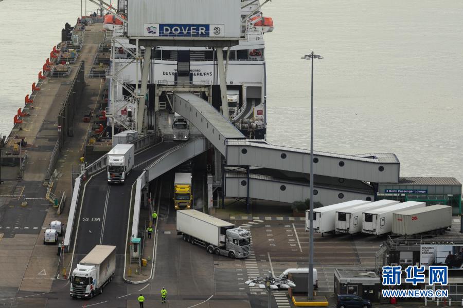 1月1日,随轮船抵达的货车驶入英国多佛港。多佛港是距离欧洲大陆最近的英国港口。