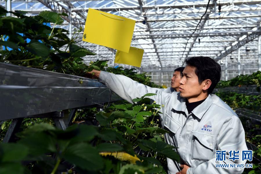 1月2日,顺昌县郑坊镇农民在当地农企“明晶农业”草莓种苗生产智慧玻璃温室里务工。