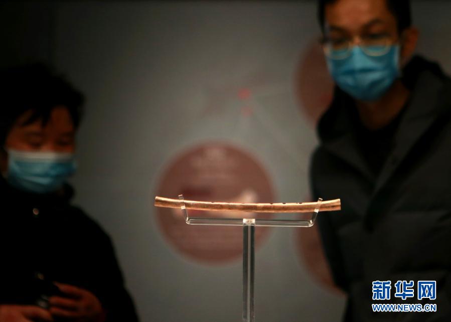 1月2日,参观者在河南博物院的“国宝特展”观看骨笛。