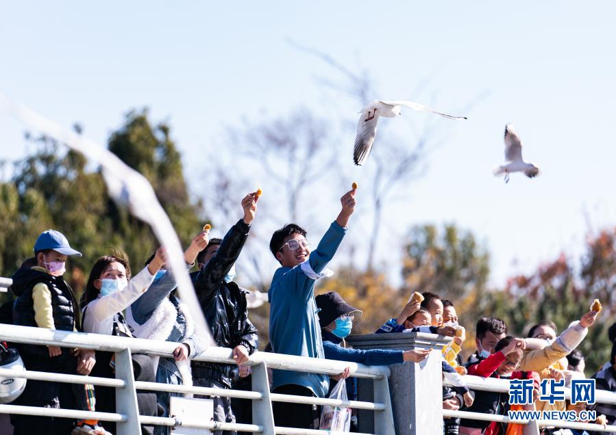 2021年1月2日,游客在昆明海埂大坝给红嘴鸥喂食。