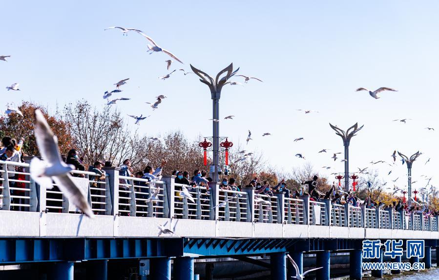 2021年1月2日,人们在昆明海埂大坝观赏、投喂红嘴鸥。