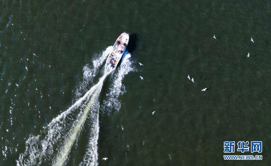2021年1月2日,游客乘坐快艇观赏、投喂红嘴鸥(无人机照片)。