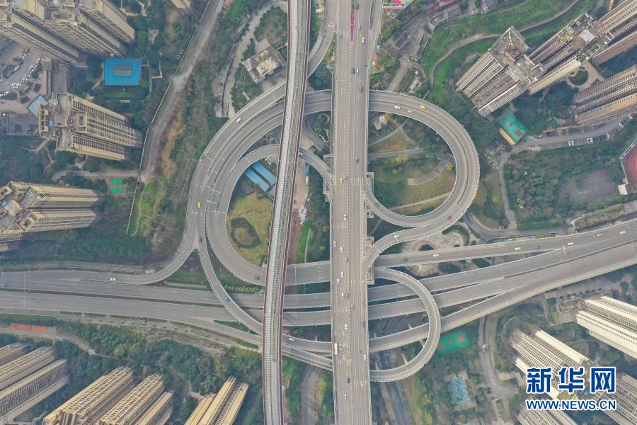 这是2020年2月12日拍摄的重庆城区立交桥(无人机照片)。新华社记者 刘潺 摄