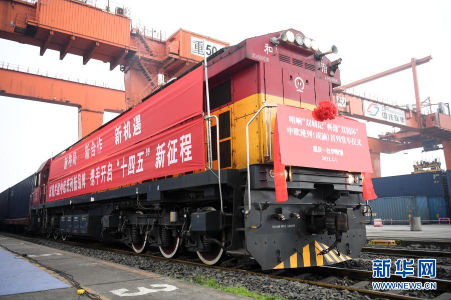 2021年1月1日,中欧班列(成渝)号首列班车在重庆团结村站等待发车。新华社记者 唐奕 摄