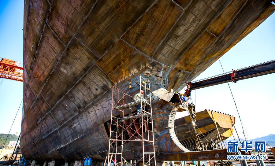 2021年1月2日,在都昌县造船总厂船舶制造工地,工人进行作业。新华社发(傅建斌摄)