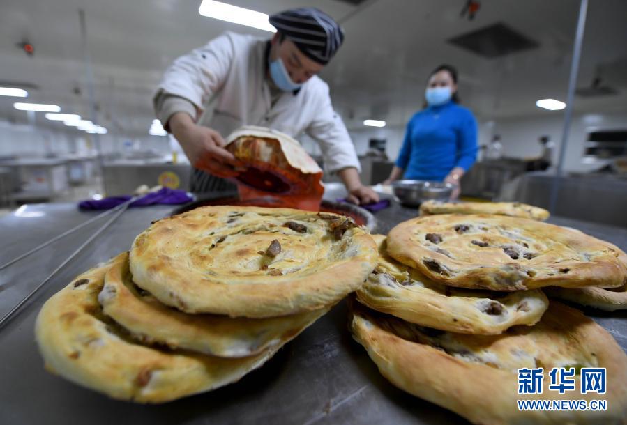 2021年1月2日,在阿勒泰市馕文化产业园,工作人员在生产车间烤馕。