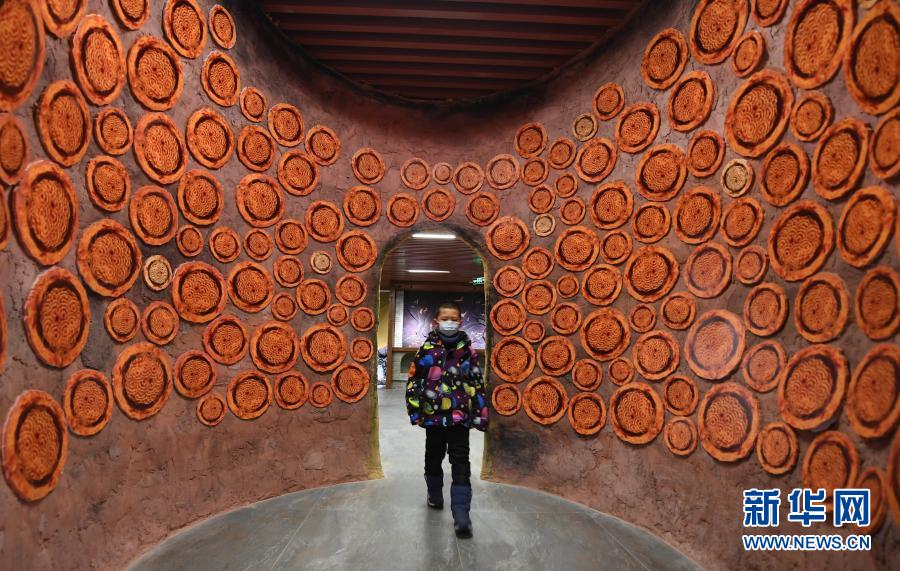 2021年1月2日,一名儿童在阿勒泰市馕文化产业园参观。
