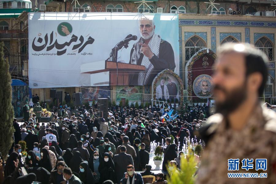 1月2日,人们在位于伊朗克尔曼的伊斯兰革命卫队下属“圣城旅”指挥官苏莱曼尼墓附近参加他的遇难周年悼念活动。