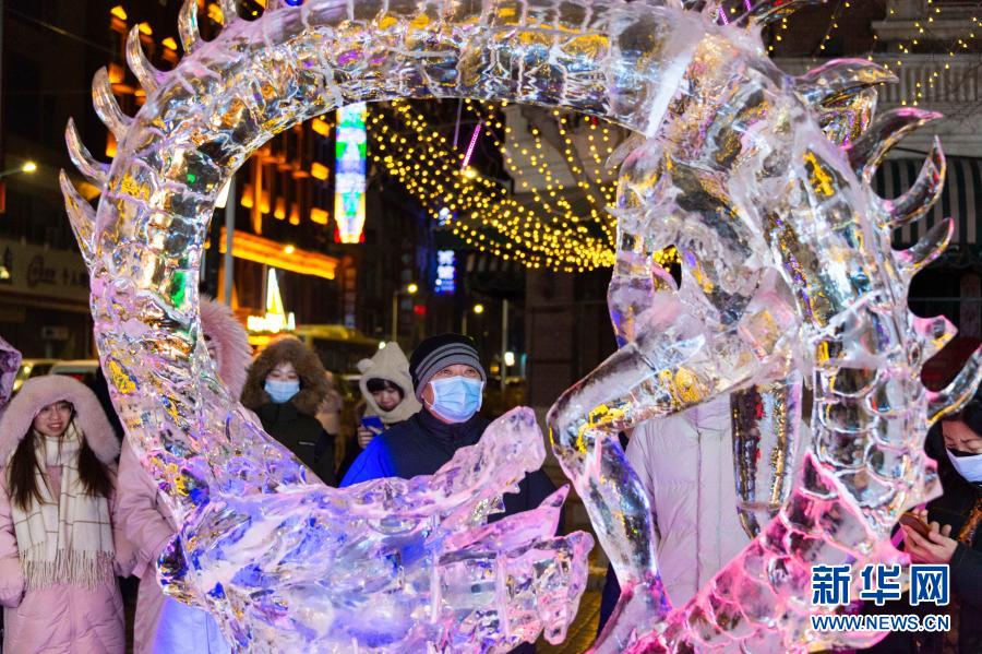 2021年1月1日,游客在哈尔滨中央大街观赏冰雕。