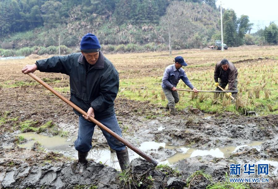 1月3日,顺昌县大历镇大历村农民为种植槟榔芋平田筑埂。新华社记者 彭张青 摄