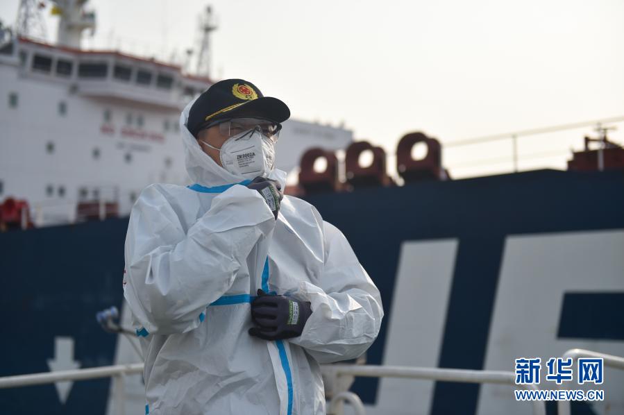 2020年12月28日,天津港引航中心引航员李占涛在登上一艘船舶前穿上防护服。