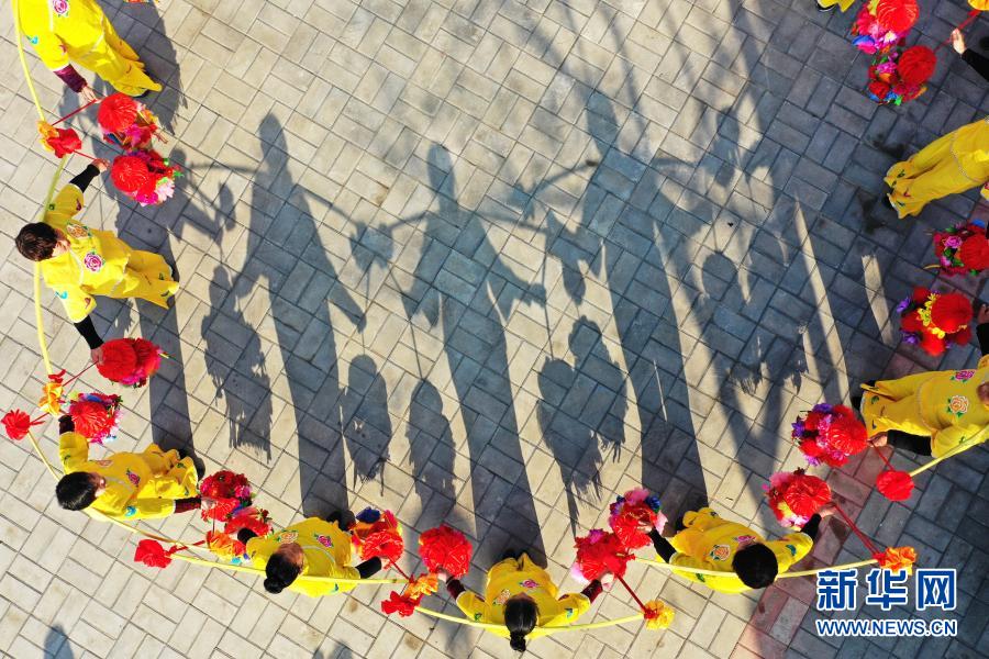 2020年12月27日,民间艺人在河南省平顶山市宝丰县张八桥镇姚店铺村表演非遗经担舞(无人机照片)。