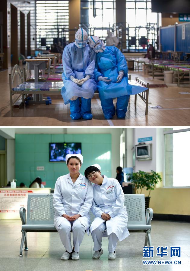 这是一张拼版照片,上图为:2020年3月10日,青海医疗队队员刘海婷(左)与许国娟在武昌方舱医院等待出舱时小憩(新华社记者费茂华摄);下图为:2020年12月16日,海东市第一人民医院内科护士刘海婷(左)与海东市第二人民医院眼科护士许国娟重逢时拍摄合影(新华社记者张龙摄)。