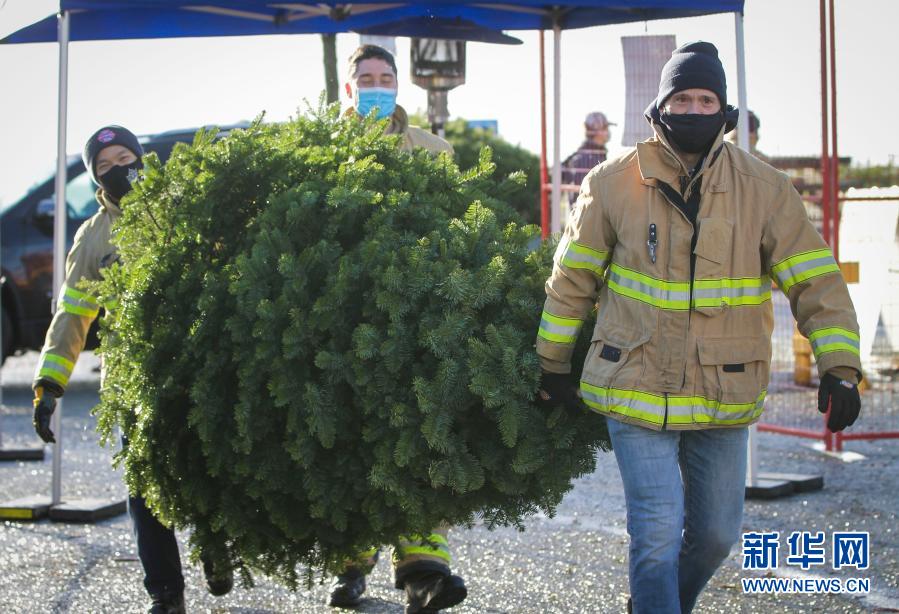 1月3日,在加拿大里士满,消防员搬运回收的圣诞树。