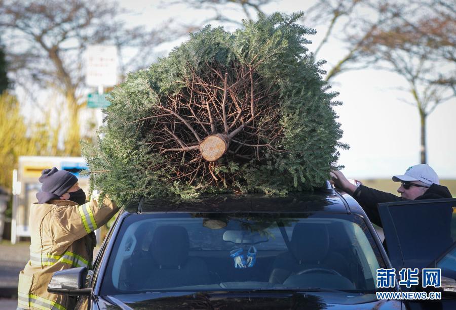 1月3日,在加拿大里士满,消防员帮助居民从车上卸下回收的圣诞树。