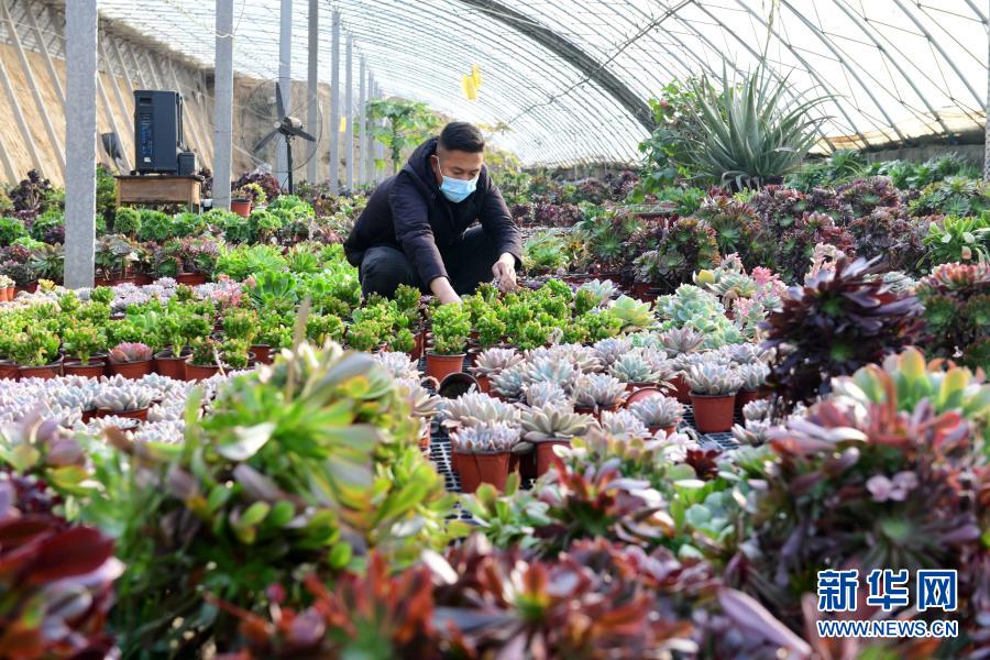 1月4日,花农在河北省石家庄新乐市邯邰镇坚固村大棚内管护多肉植物。