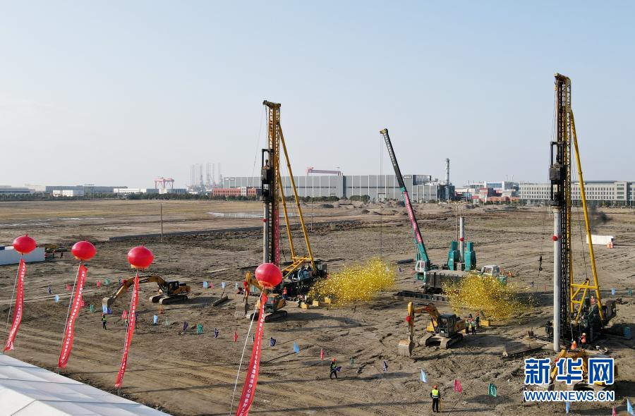这是1月4日拍摄的位于上海临港新城的12英寸车规级功率半导体晶圆制造中心项目开工仪式现场(无人机照片)。当日,上海市重大项目集中开工仪式在上海展览中心启动,并设7个分会场,共有64个重大项目集中开工,总投资超过2700亿元。