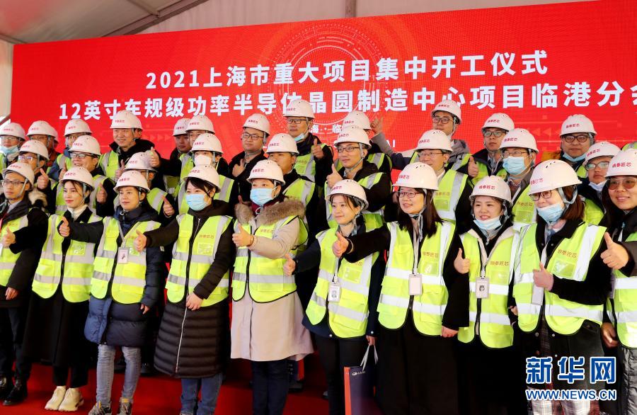1月4日,企业员工代表在上海临港新城的12英寸车规级功率半导体晶圆制造中心项目开工仪式现场合影。新华社记者 方喆 摄