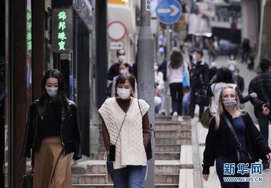 2021年1月4日,在香港中环,市民佩戴口罩走在中环半山上。