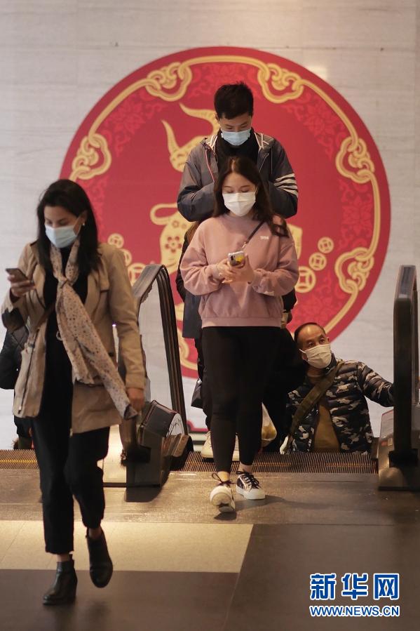2021年1月4日,在香港中环,人们佩戴口罩走出电梯。