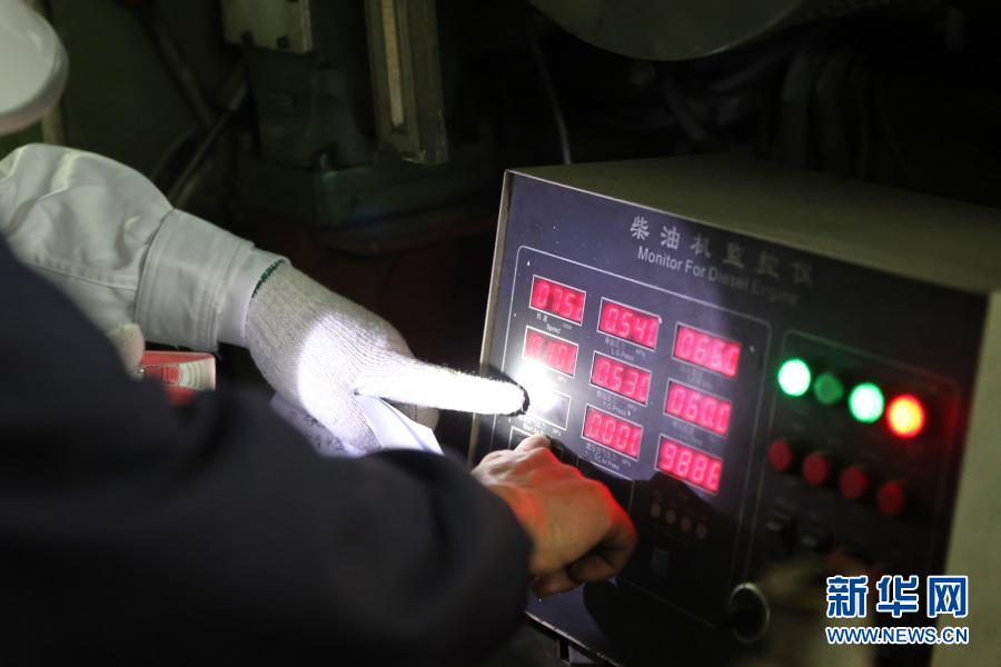 1月4日,海口海事局工作人员对客滚船机舱设备进行检查。