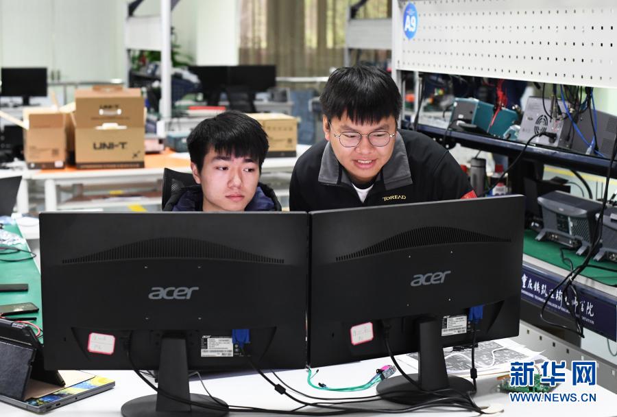 梁攀(右)在位于重庆铁路运输技师学院的世界技能大赛电子技术项目重庆集训基地指导学生(2020年11月24日摄)。