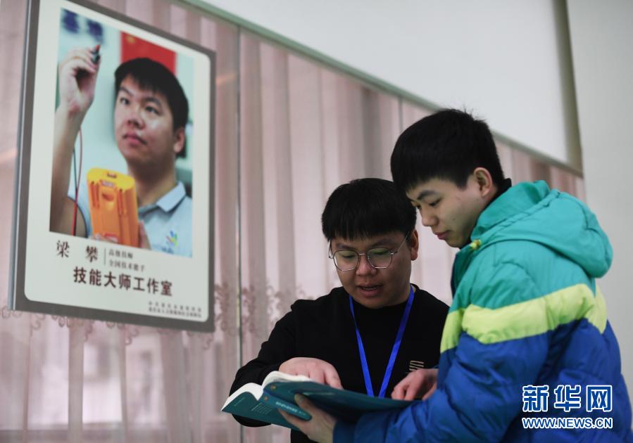 在位于重庆铁路运输技师学院的世界技能大赛电子技术项目重庆集训基地,梁攀(左)与助理教练胡继龙交流(2020年12月30日摄)。